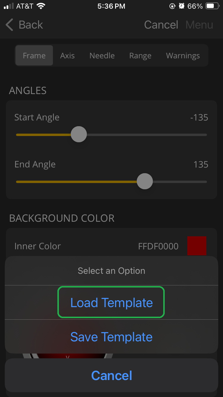 In the Menu Options dialog, tap Load Template. - You will see a list of display templates. Scroll to find the one you want to use.