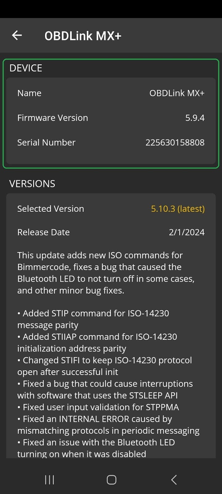 - You will see the current firmware version for your OBDLink adapter.